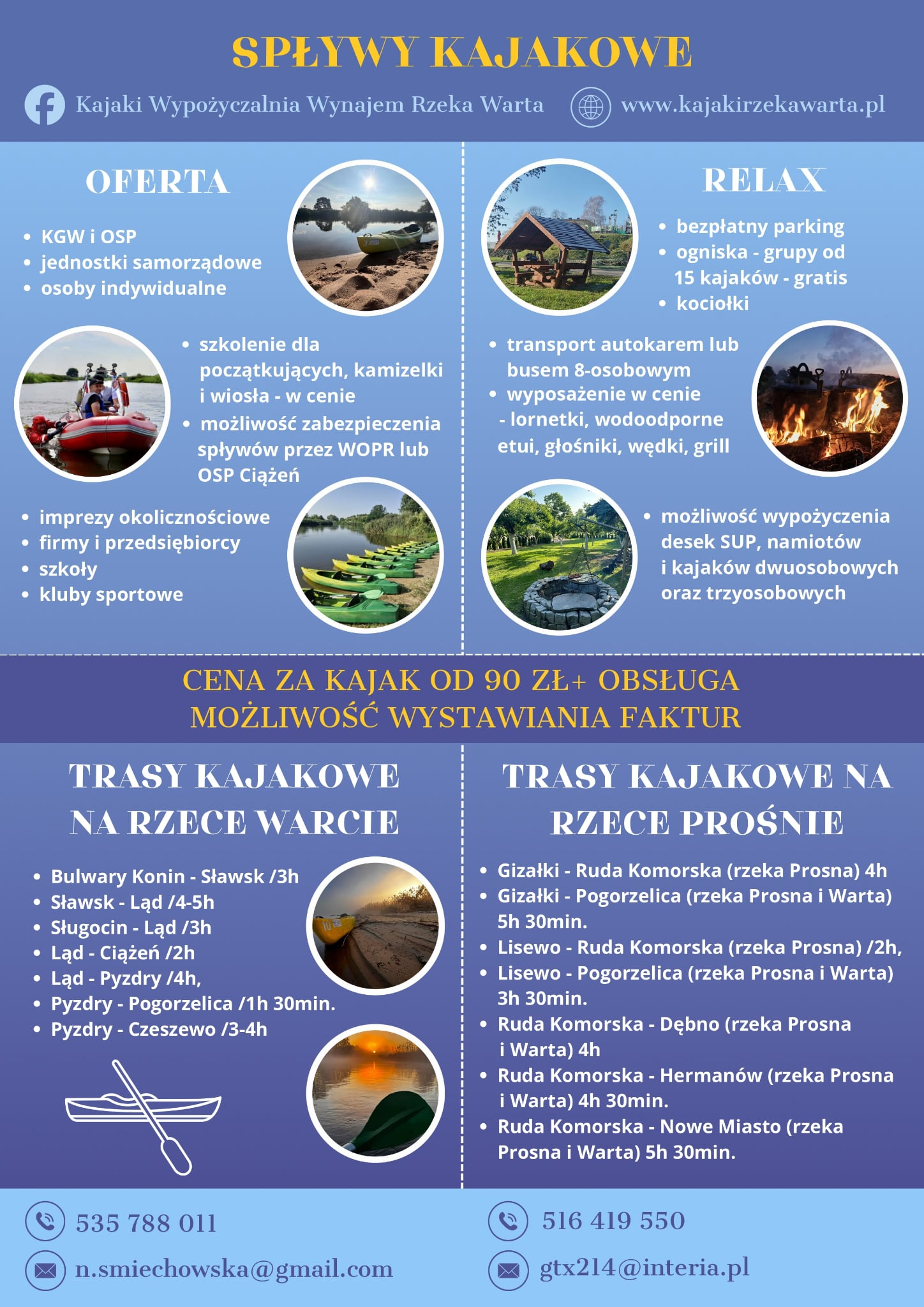 Oferujemy wynajem kajaków dwuosobowych z pełnym wyposażeniem oraz organizację spływów kajakowych na rzece Warcie i Prośnie. Wypożyczysz u nas także sprzęt turystyczny: deski SUP, namioty, materace, agregaty, bagażniki rowerowe, grill i więcej. Zapewniamy transport busem oraz możliwość zabezpieczenia spływu przez ratowników.
